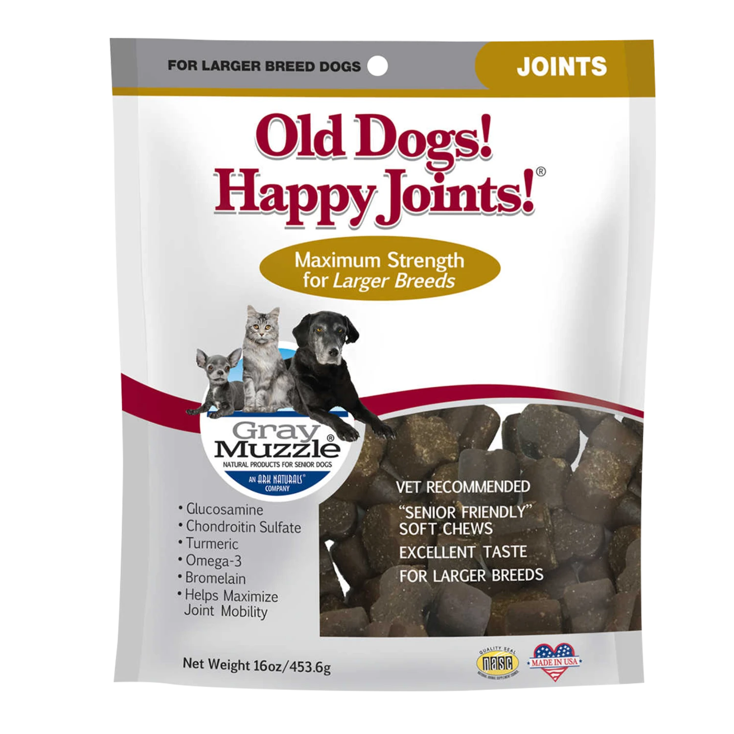 “Senior Friendly” bite size soft chews with excellent taste and a healthful purpose! Old Dogs! Happy Joints! is helpful for senior dog mobility, flexibility and discomfort associated with aging. Each soft chew contains glucosamine, turmeric, New Zealand green-lipped mussel, chondroitin, and egg albumin.