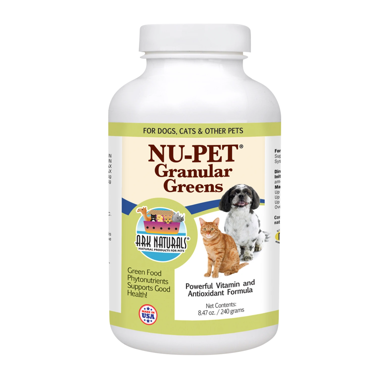 NuPet® Granular Greens supports your pet’s good health and helps to support a healthy immune system. Great for dogs and cats, however our NuPet Feline Antioxidant is a better choice for cats. Contains natural ingredients. Contains NO yeast, chemicals, preservatives, sugars, starch, or glutens. Non irradiated. Made in the USA.