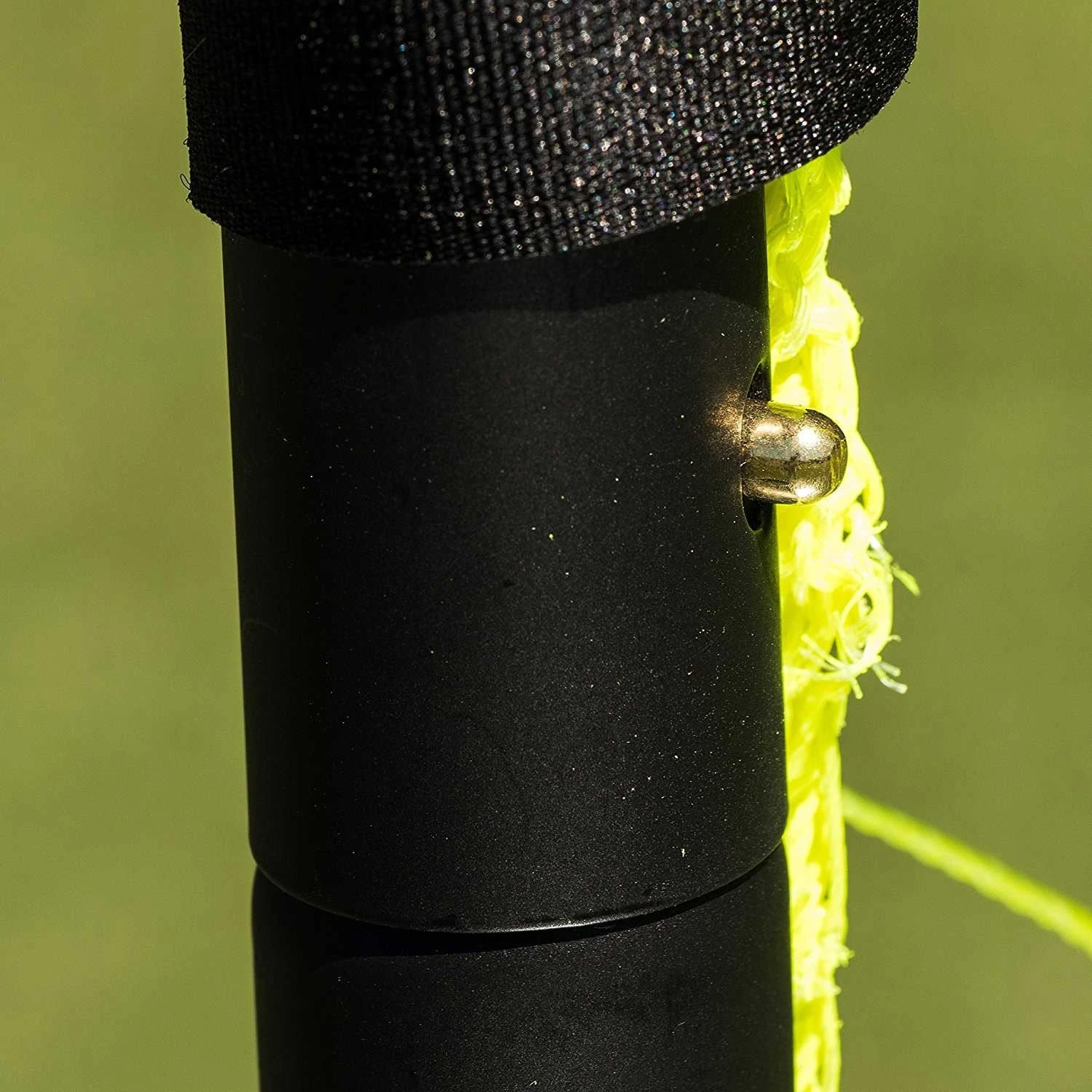 The steel goal is easy to set up, precision locking pins secure the poles together and galvanized ground stakes that keep the goal attached firmly to the ground.