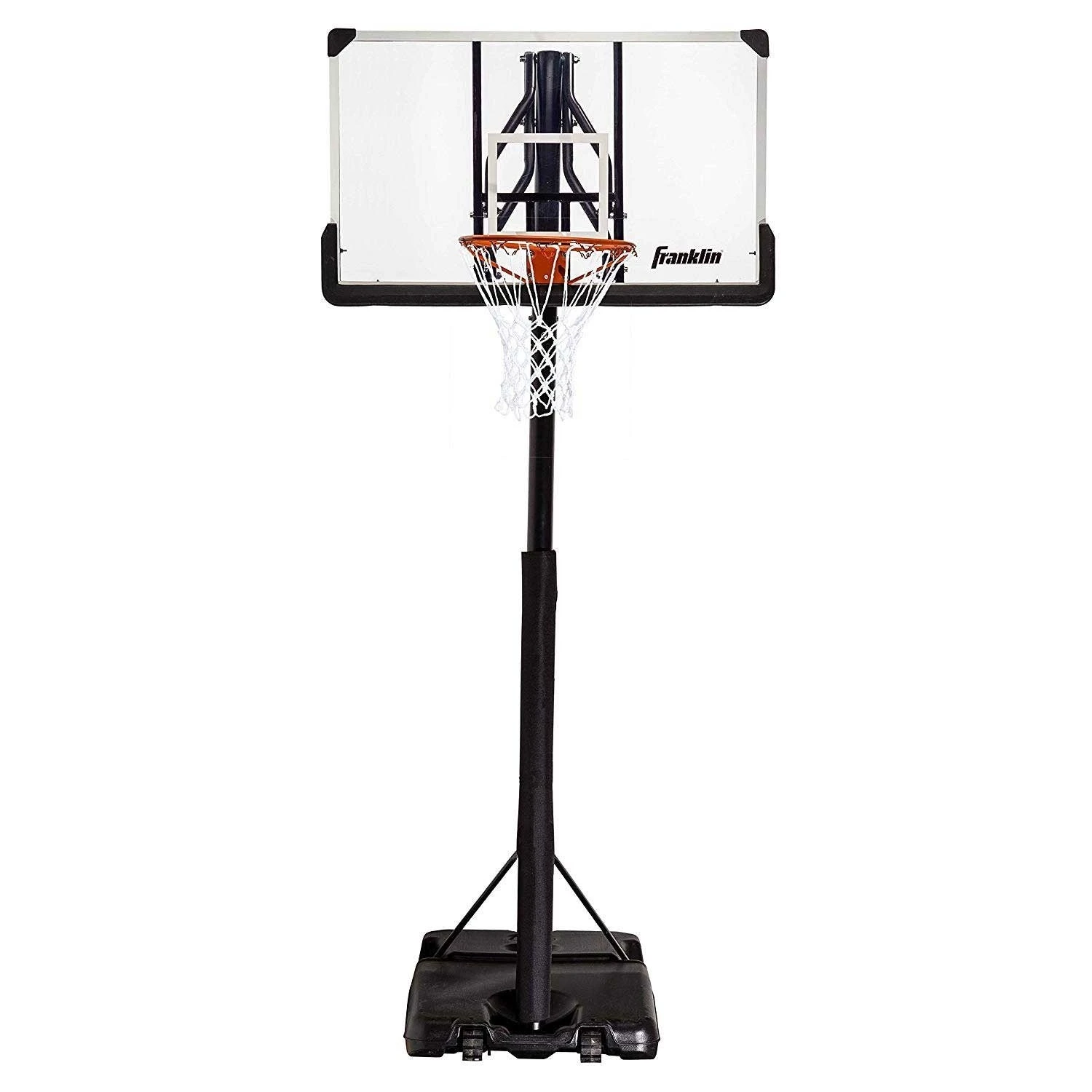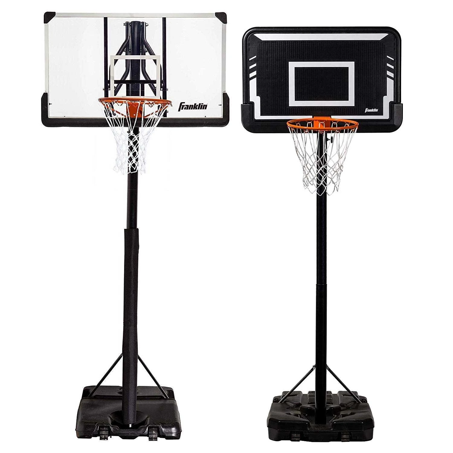 The Franklin Sports adjustable portable Basketball hoop with 48 inch or 44 inch durable Plexiglas backboard is perfect for recreational fun at home. Franklin Sports adjustable portable Basketball hoop includes a 48 inch durable Plexiglas backboard, a steel Basketball rim and a 22-gallon or 28-gallon base. The adjustable post allows you to adjust the Basketball goal from 6.5-10 feet so that players of any age can enjoy the game at their level.