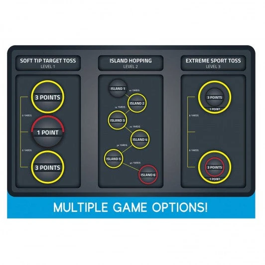 Franklin’s Soft Tip Target Toss Game allows you to test your physical accuracy and mental creativity. You and your friends or family can design the playing field and set up Franklin’s Soft Tip Target Toss Game anywhere. Hang the scoring rings from trees, in the water or just on the grass in your backyard and throw the tosses between, or within the ring to score a point. Warm up by placing the rings close together and continue to spread them apart as the game goes on to increase difficulty.Â